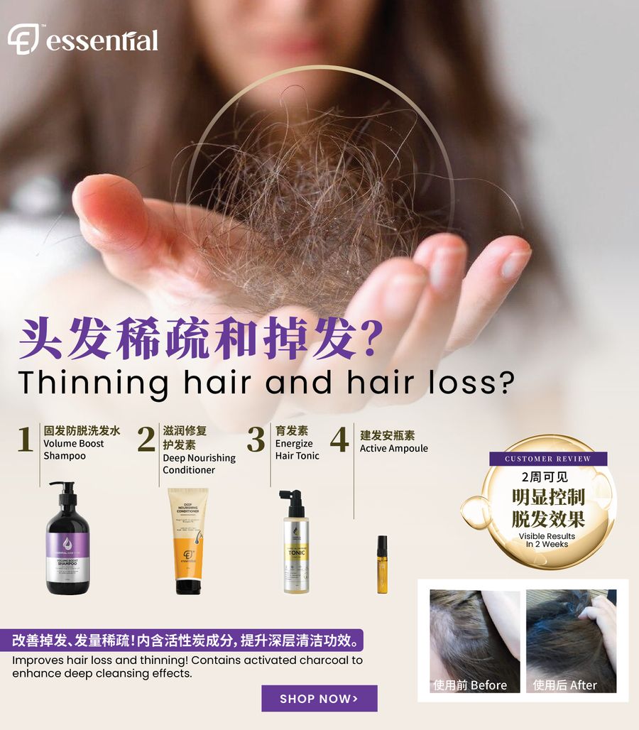告别掉发与发量稀疏!Essential 的 VB Shampoo + Hair Tonic + Activ Ampoule 三重护理,从根源强化发根、调理头皮循环、刺激新发生长。系统改善发量稀疏、断发与油性头皮问题,让头发更浓密、更健康。